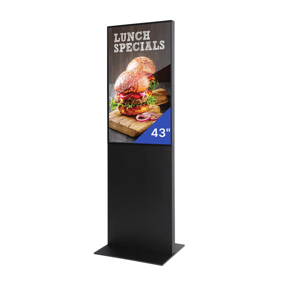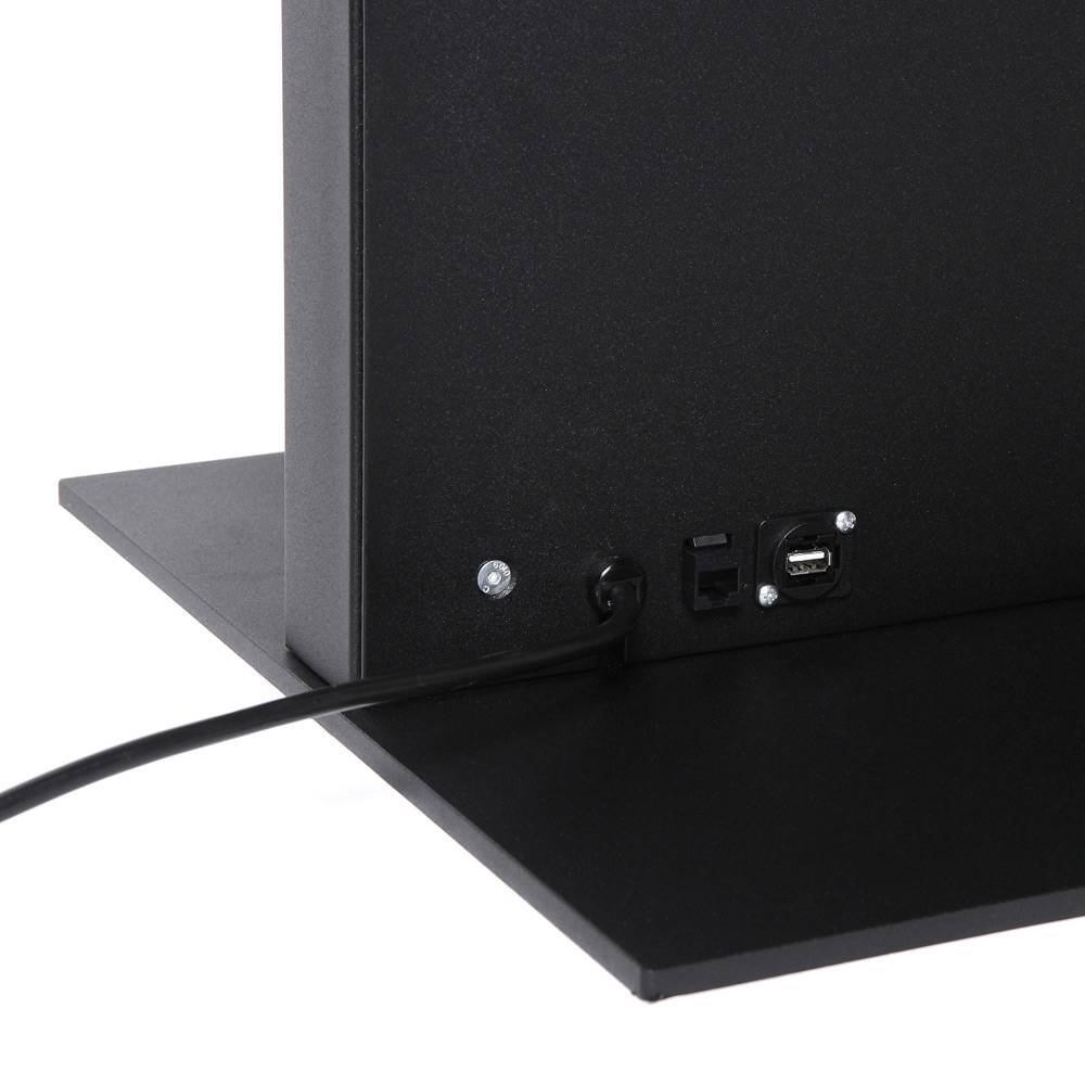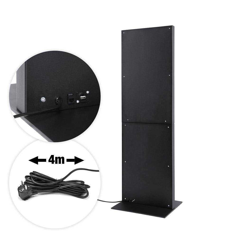 De behuizing is gemaakt van hoogwaardige metalen platen die perfect om het professionele Samsung scherm passen. Deze digitale totem is standaard leverbaar in zwart en wit met een 43” scherm, andere afmetingen en RAL-kleuren zijn uitsluitend op aanvraag. De behuizing is gemaakt om het scherm te beschermen, maar ziet er tegelijkertijd elegant en modern uit. De voet van een 8 mm zware staalplaat is ontworpen om optimale stabiliteit te garanderen.